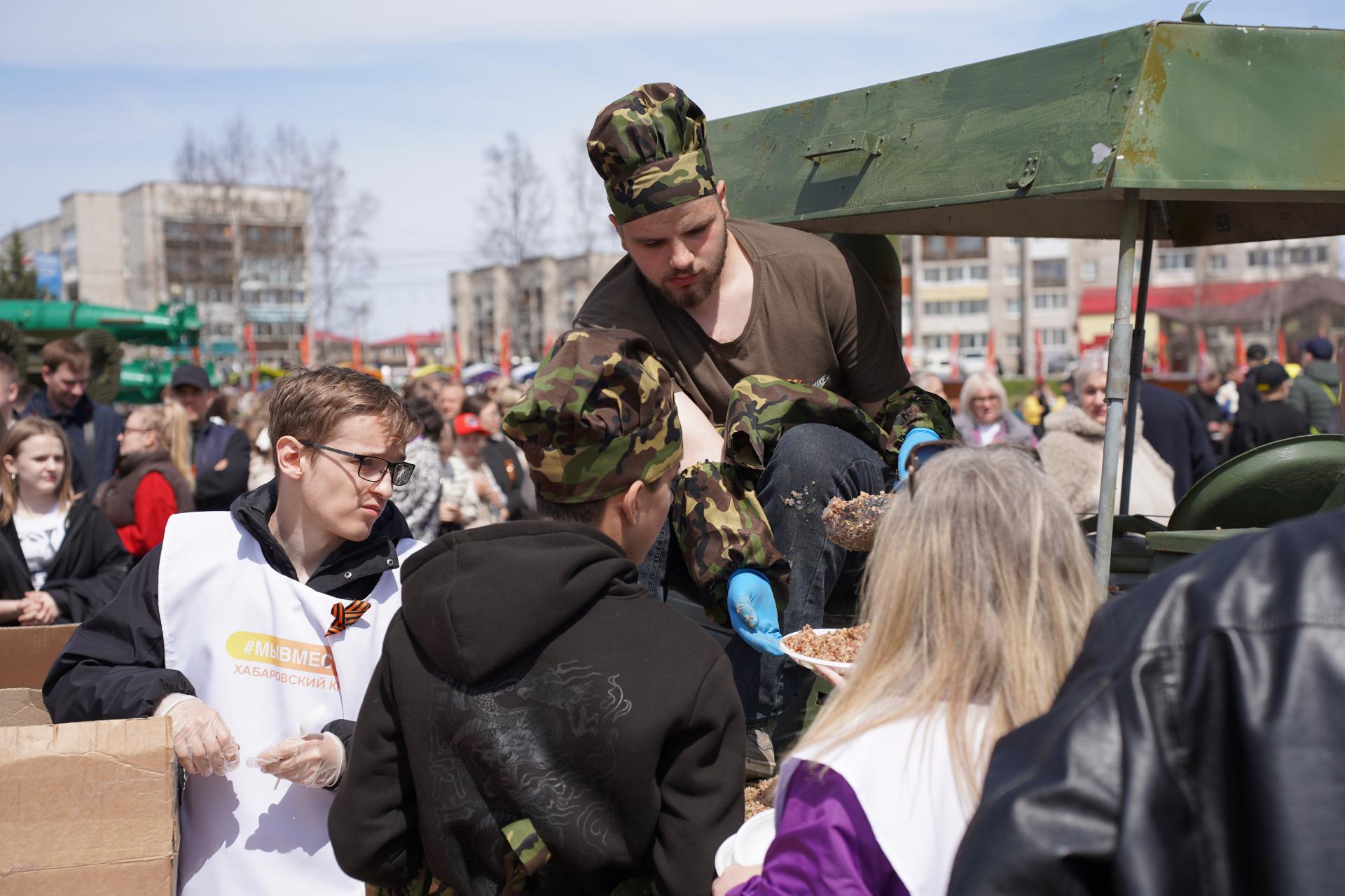 Подразделения военнослужащих и представители молодёжных патриотических организаций района торжественно проследовали мимо трибун, затем праздник продолжился традиционным концертом, угощением солдатской кашей, выставкой военной техники.