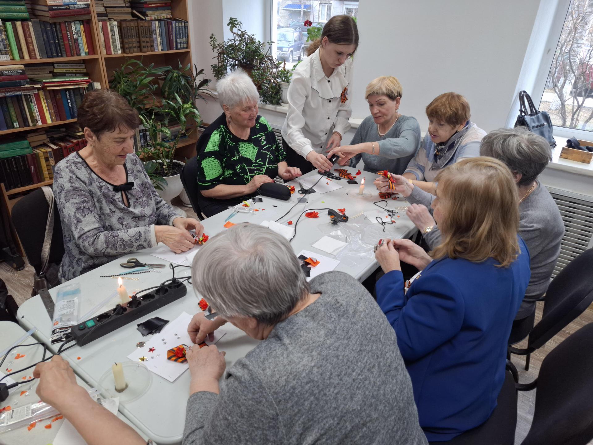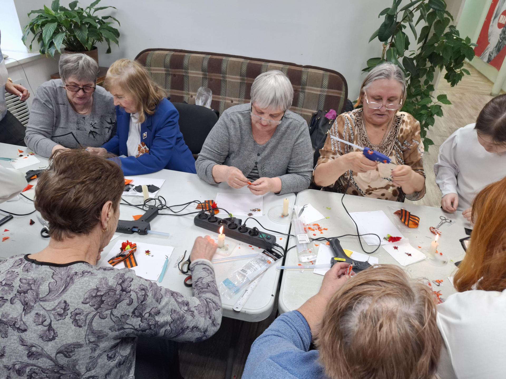 Уютная атмосфера, добрые улыбки и шуршание ленточек – с первых минут мастер-класса участницы погрузились в работу. Ведущая мастер-класса, Марина Струк, шаг за шагом показывала, как правильно сложить георгиевскую ленточку, как изготовить каждый лепесток, добавить декоративные элементы и фурнитуру для броши.
