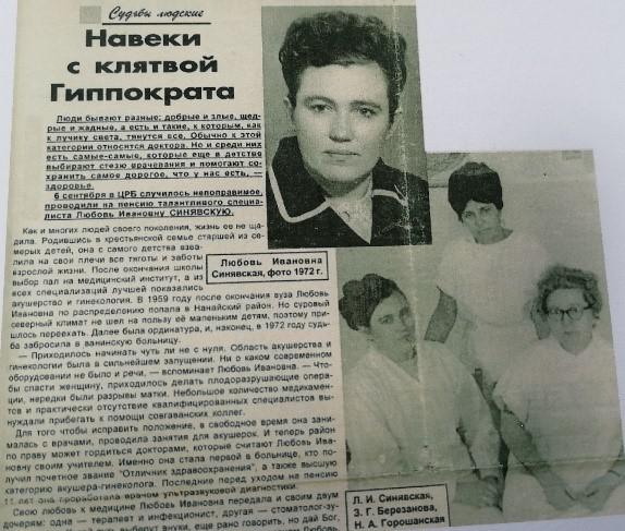 После окончания института супруги-врачи Синявские были направлены в Нанайский район. Работали в п. Маяк, а затем в с. Троицком. Оказывая медицинскую помощь коренным малочисленным народам Дальнего Востока, им приходилось добираться к пациентам на собачьих упряжках, с помощью вертолёта, на лошадях. Это было тяжёлое, но очень интересное время.