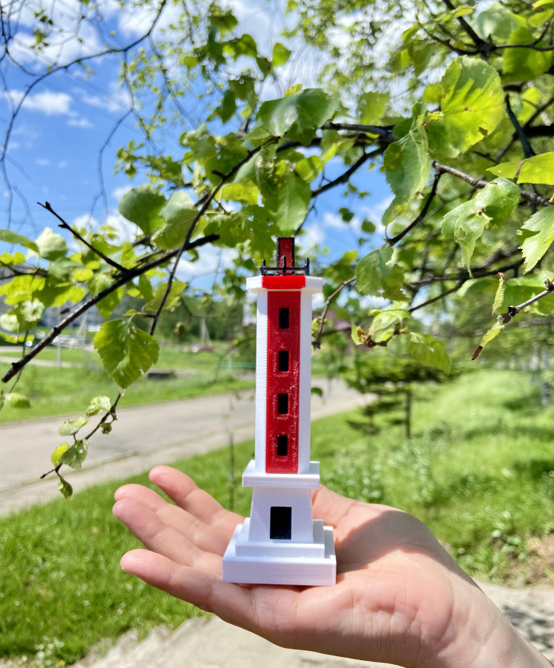 Но на печати фигурок по готовым моделям Денис не остановился. Первым опытом в самостоятельном моделировании для него стал ванинский маяк. Спустя множество проб и ошибок, наконец удалось создать макет.