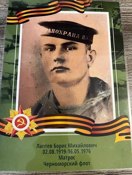 Одним из борцов, с коварной судьбой, прошедшим всё от начала до конца, был мой прадедушка Лаптев Борис Михайлович. Родился Борис Михайлович в 1919 году в Кировской области. В семье он был единственным ребёнком, а воспитывали его мама и бабушка, отца забрала война. На начало Великой Отечественной войны он проходил военную службу в морфлоте на Чёрном море в пограничных войсках в должности матроса-моториста. Фашистские войска стремительно захватывали территории необъятной родины России, оккупировали города с молниеносной скоростью, подвергали русский народ пыткам голода. Город Новороссийск, тяжело захваченный немцами в сентябре 1942 года, стал вовсе не случайным городом в судьбе моего прадедушки.