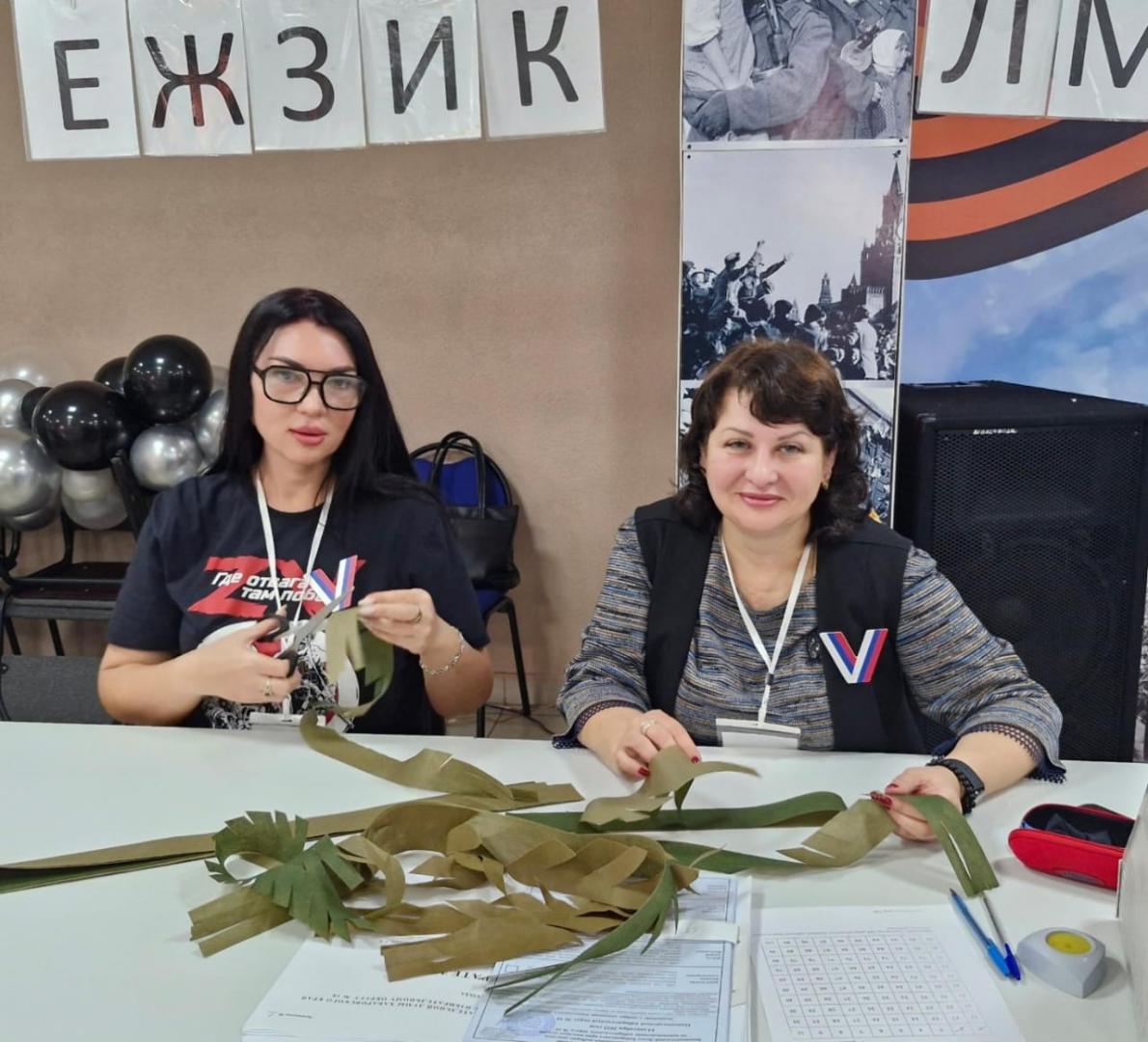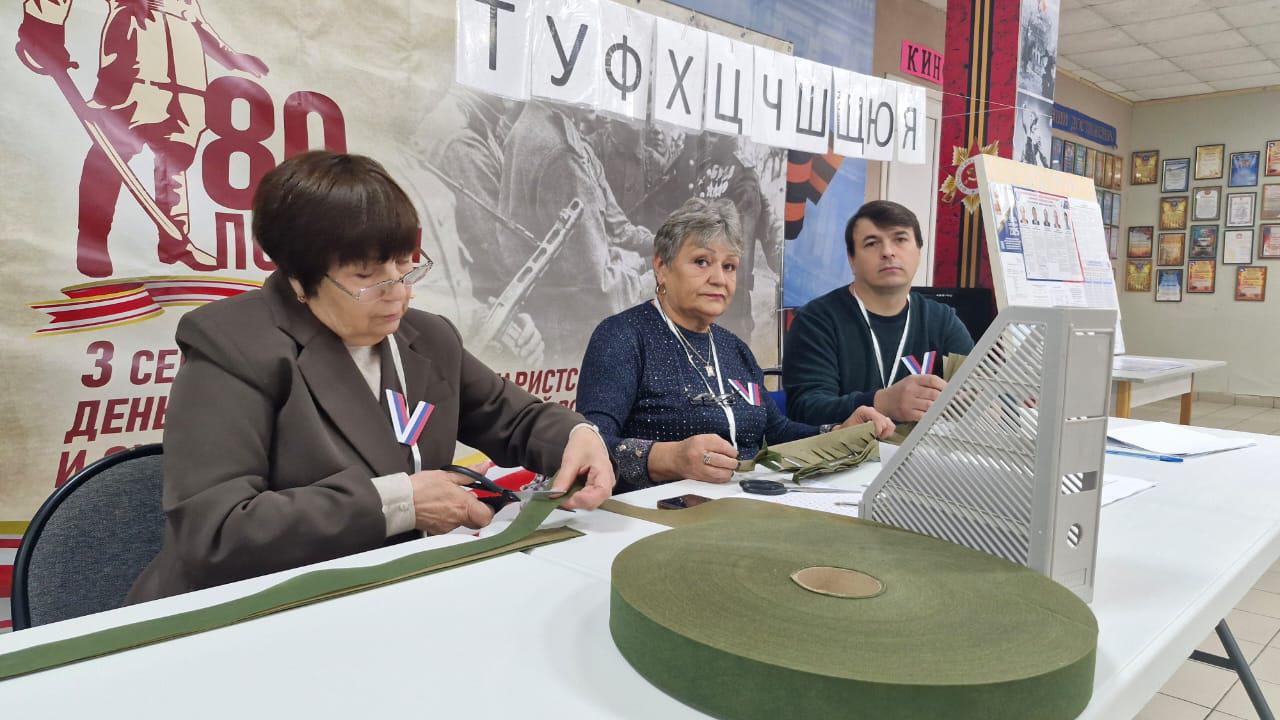 В поселке Высокогорный жители не только проявляли свою гражданскую позицию, но и помогали участникам СВО. В этот день на участке развернулся пункт плетения маскировочных сетей.