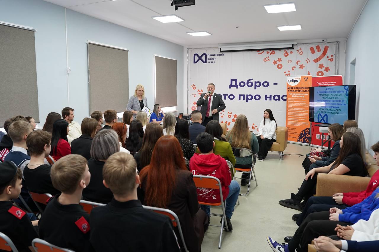 В молодёжном пространстве «Добро.Центра» состоялась встреча, которую с уверенностью можно назвать диалогом поколений. Глава Ванинского района Алексей Маслов и председатель комитета по делам молодёжи правительства Хабаровского края Амалия Шихалева провели открытый разговор с самой активной и инициативной молодёжью района.